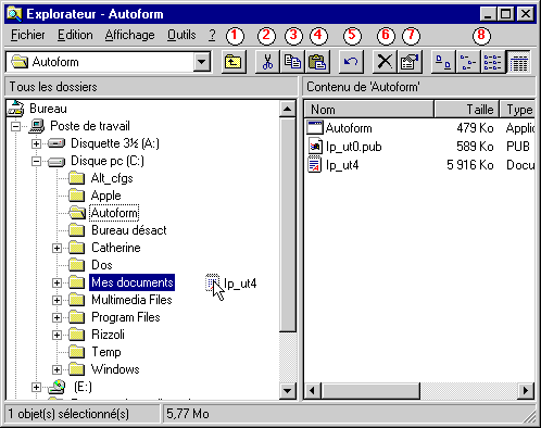 L'explorateur de Ms-WindowsEn cliquant sur l'icône de l'application "Explorateur Windows", vous découvrez une fenêtre semblable à celle-ci. Le cadre gauche montre le contenu des différents lecteurs, disquettes, disque dur, cédéroms. En cliquant sur la croix qui précède les lecteurs ou les dossiers, vous développez une branche. Ici nous avons ouvert le disque du PC [C:] et nous voyons tous ses répertoires. Nous constatons que certains de ceux-ci ont des sous-répertoires, Mes documents par exemple. Nous avons sélectionné Autoform avec un clic et son contenu apparaît dans le cadre droit de la fenêtre. Puis nous avons selectionné le fichier Ip_ut4. En maintenant le bouton gauche de la souris enfoncé, nous sommes en train de le déplacer dans le cadre gauche, précisément dans le répertoire Mes documents qui se met en surbrillance quand le pointeur se met à son niveau. En relâchant le bouton de la souris, le fichier se dépose dans son nouveau répertoire. On aurait pu tout aussi bien le déplacer vers la Disquette 31/2[A:].