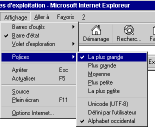 Le menu Affichage permet de modifier l'aspect de la fenêtre en cochant ou décochant les options Barres d'outils, Barre d'état, Volet d'exploration. Polices : Accès aux options d'affichage du texte Arrêter : Arrête le chargement d'un document (id Barre des outils). Actualiser : permet de recharger la page. C'est indispensable lorsqu'on a modifié une page affichée à l'écran avec un éditeur de pages HTML et que l'on veut voir le résultat dans le navigateur. Source : Affiche le code-source de la page affichée Plein écran : Ouvre la fenêtre en plein écran Options Internet : Accès à la configuration de l'application.
