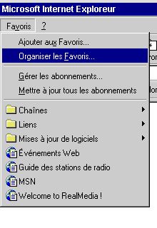 Le menu Favoris, donne accès et à la gestion des Signets (Bookmarks en anglais) enregistrés précédemment. Ajouter aux favoris : Ajoute l'adresse d'une page à la liste des favoris. Par la suite, en cliquant sur un favori, vous accédez directement à la page sans avoir à écrire son adresse. Organiser les favoris : Permet la gestion des favoris (renommer, regrouper en dossiers ...). Dans le menu ci-contre certains signets ont été regroupés dans des répertoires qui peuvent contenir des sous-répertoires.