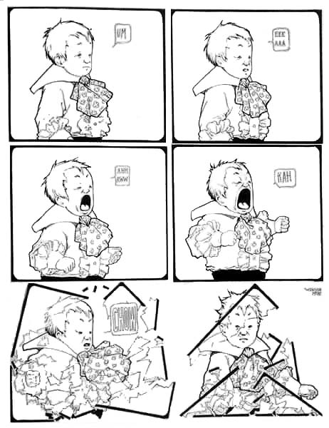 Le son brise le cadre de l'image Sous l'effet explosif d'un éternuement, le cadre de la case vole en éclats.